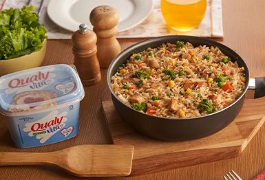 Na hora de assar, passe Qualy Vita por cima das coxas e sobrecoxas, coloque as cebolas, o alho, o tomilho e leve para assar em forno pré-aquecido a 180 °C por 1h30, ou até que esteja assado e com a crosta dourada.